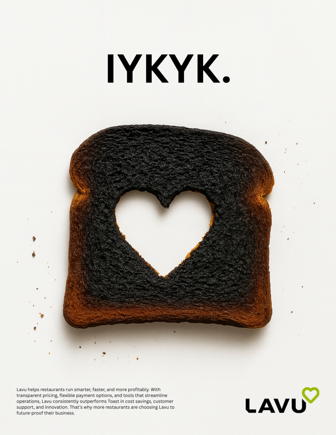 The concept began with a simple, powerful anchor: IYKYK. A modern wink to those who’ve lived through the frustrations of bloated systems and unpredictable costs. From there, the visual language took shape through metaphor-driven imagery designed to hit instantly. A dried clover representing disappointment. A burnt slice of toast revealing the heart that so often gets lost in the demands of the restaurant world. Clean, minimal, and bold, each execution was designed to speak directly to operators without ever needing to name the competition.